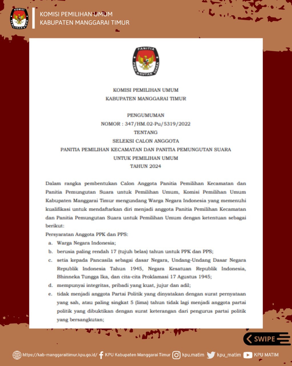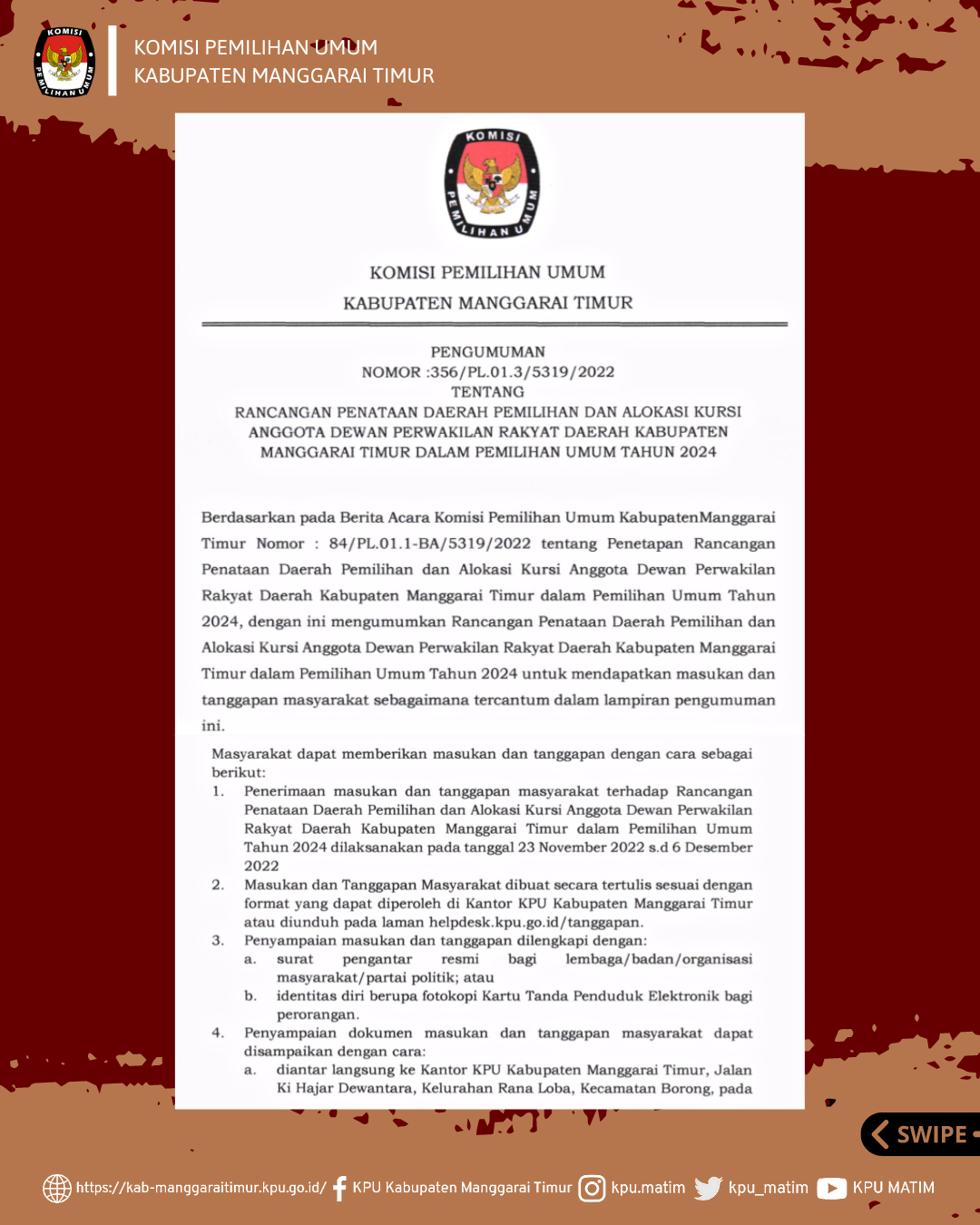 PENGUMUMAN RANCANGAN PENATAAN DAERAH PEMILIHAN DAN ALOKASI KURSI ANGGOTA DEWAN PERWAKILAN RAKYAT DAERAH KABUPATEN MANGGARAI TIMUR DAI,AM PEMILIHAN UMUM TAHUN 2024 (Klik Teks)