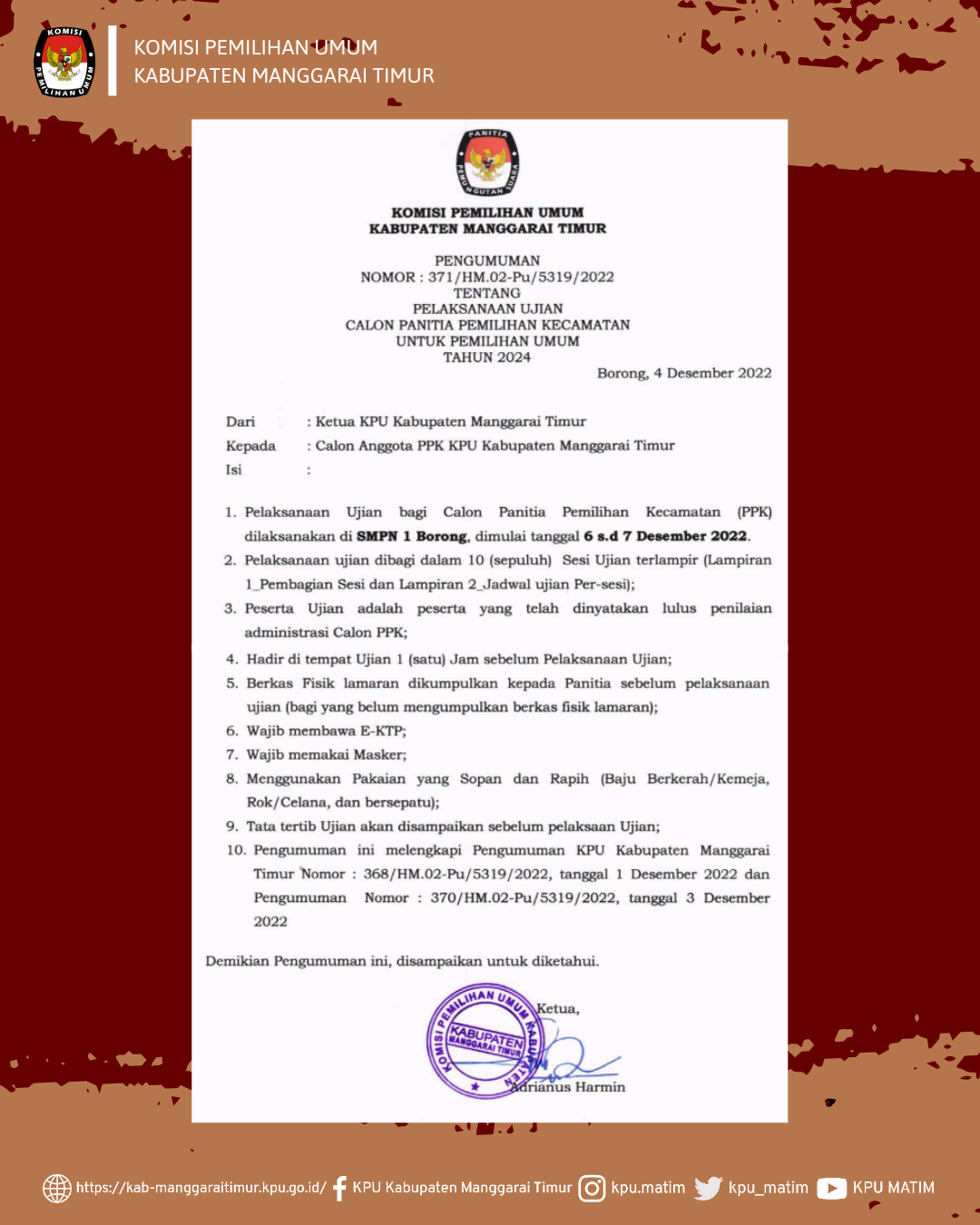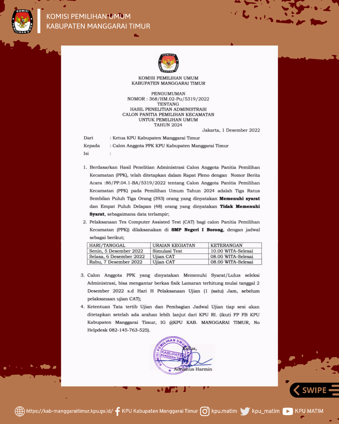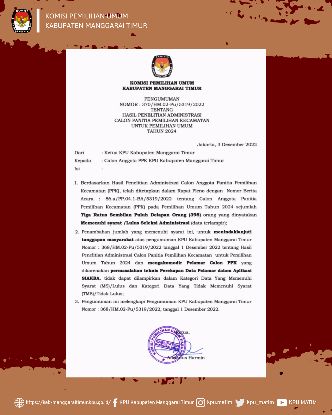 PENGUMUMAN NOMOR : 368/HM.02-Pu/ 5319/2022 TENTANG HASIL PENELITIAN ADMINISTRASI CALON PANITIA PEMILIHAN KECAMATAN UNTUK PEMILIHAN UMUM TAHUN 2024 (Klik Teks)